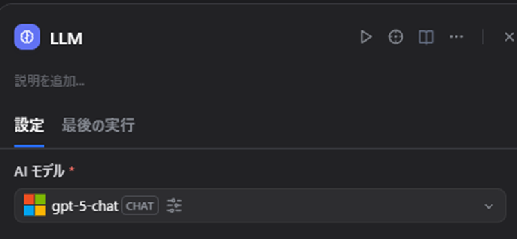 そうすると、LLMノードのAIモデルが以下のように、gpt-5-chatになるはずです。