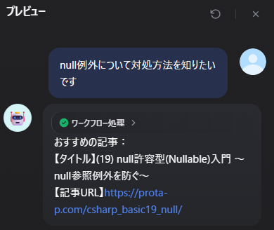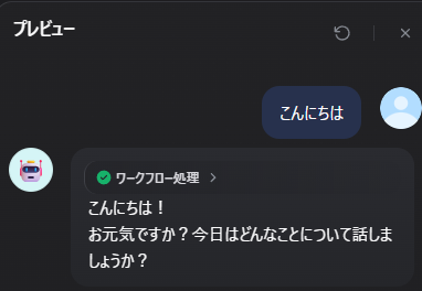 試しにプレビュー実行してみましょう。LLM設定ができていれば以下のようにAIとのチャットが可能です。