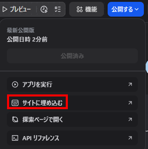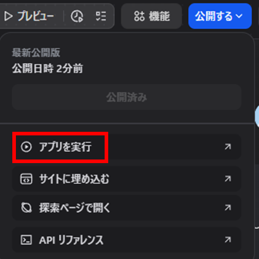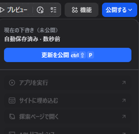Dify Cloudではアプリの公開もとても簡単です。「公開する>更新を公開」をクリックしましょう。