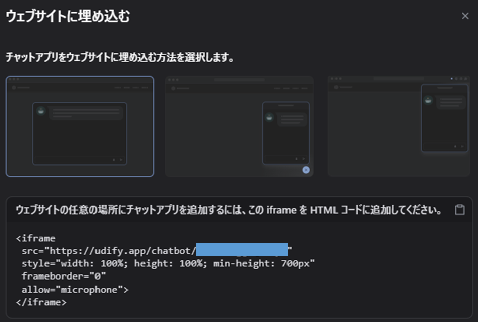 「https://udify.app/chat/●●●」というURLで、インターネット上に公開され、誰でも使える状態になっています。