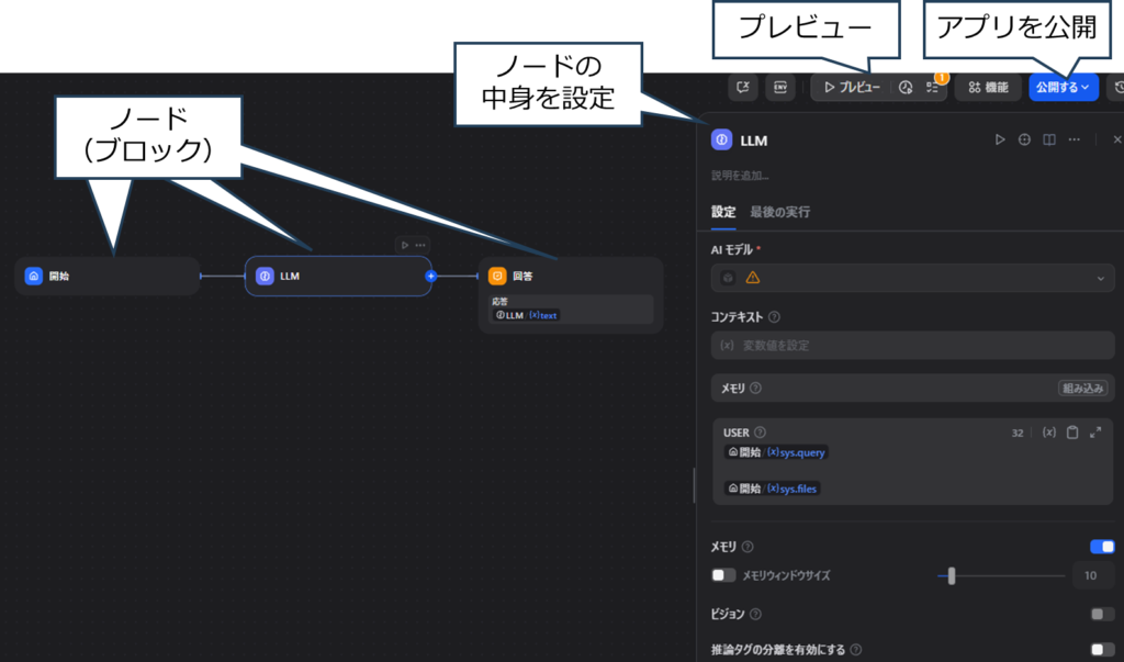 様々なノード(LLMによる回答、外部サービスとの接続など)を配置し、それらを繋げることでアプリを作ります。