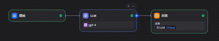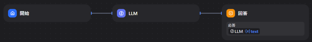 初期状態では、(1)開始、(2)LLM、(3)回答という3つのノードが配置されています。