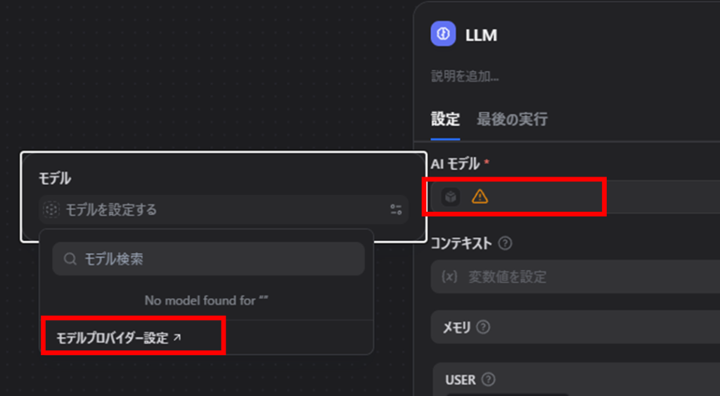 LLMノードの設定で、「AIモデル>モデルプロバイダー設定」へ進みましょう。