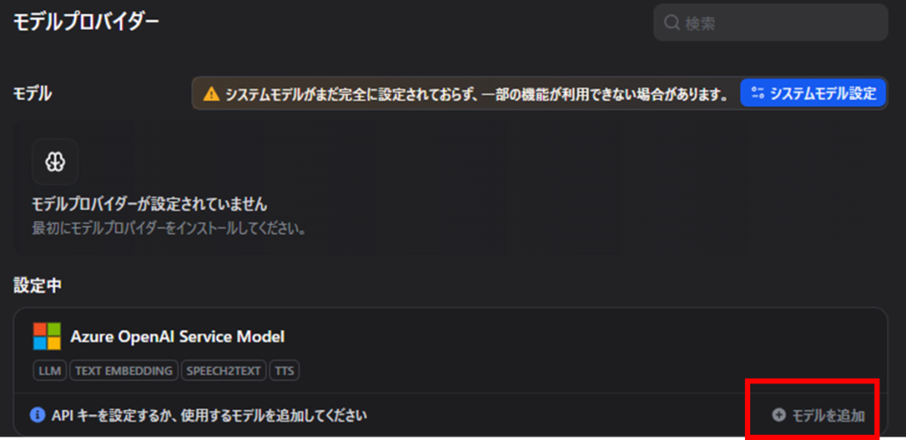 モデルプロバイダー画面でAzure OpenAI Service Modelが表示されるので、「モデルを追加」を選びます。