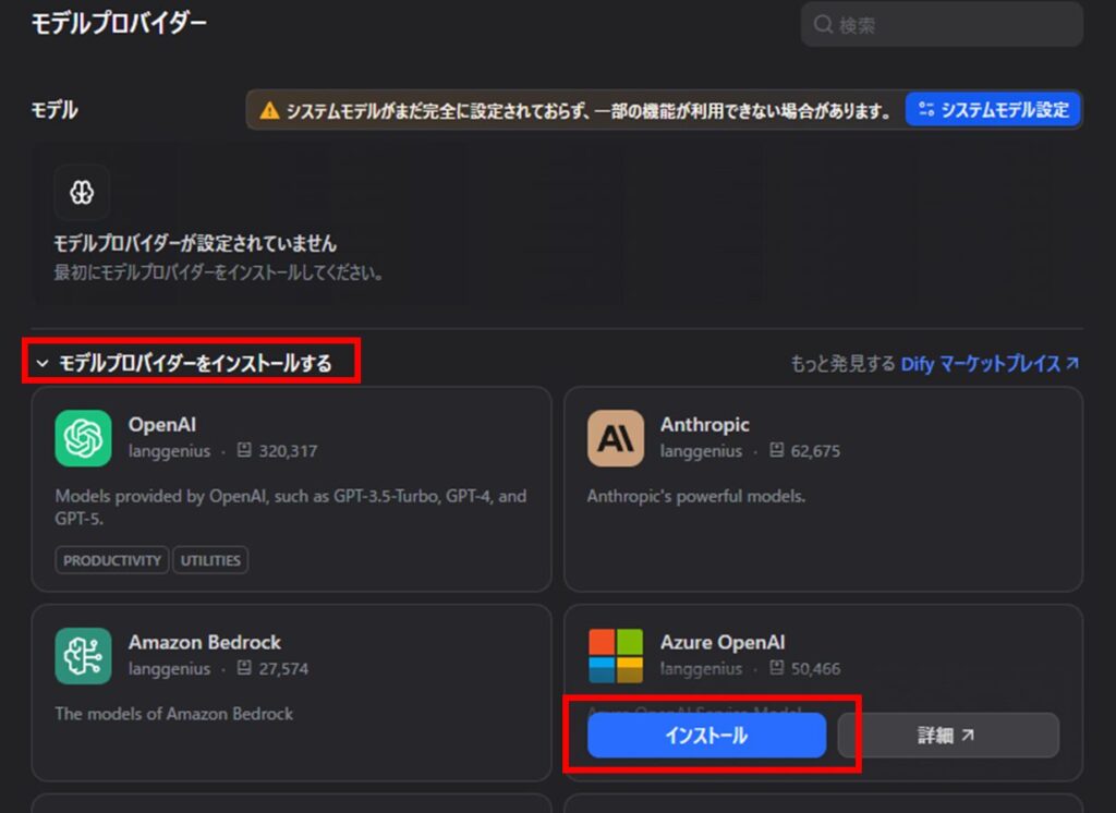 モデルプロバイダーとしてAzure OpenAIを選んでインストールします。(自分が使うLLMにあわせたものをインストールしましょう)