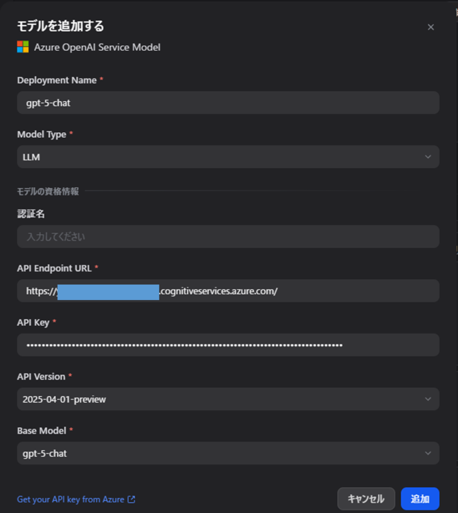 以下のようにAzure OpenAIで作成しておいたモデルの情報を設定して追加します。