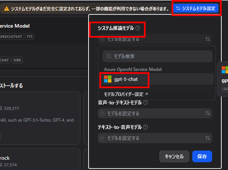 最後に、システムモデル設定で、システム推論モデルとして登録したモデル(gpt-5-chat)を設定して保存します。