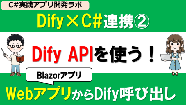 アプリ開発ラボ 【C#実践アプリ開発ラボ】Dify x C#連携② ~C#からDify APIを呼び出す方法(HttpClient・BlazorでAIチャット実装)~ 2025年11月10日 プロ太 アプリ開発ラボ編です。今回は、前回作成したDifyアプリをC#から呼び出す方法を紹介します。 前回はDify CloudでAIチャッ …