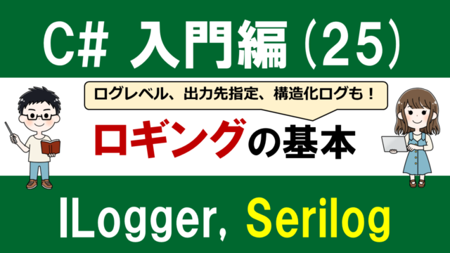 C#入門編 C#入門編(25)ロギングの基本 ~ILoggerの使い方とSerilogでファイル出力する方法~ 2025年12月30日 プロ太 C#入門編です。今回はC#におけるロギング(ログ出力)について解説します。 「Console.WriteLineでデバッグしてるけど …