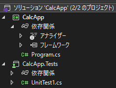 • 4.CalcApp.Testsを右クリック →「追加」→「プロジェクト参照」→ CalcAppにチェック