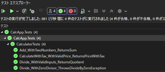 「すべてのテストを実行」(Ctrl+R, A)をクリックすると、テストが実行されます。