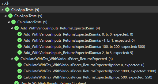 テストを実行すると、テストエクスプローラーでは各[InlineData]が個別のテストとして表示されます。