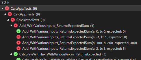 AddCalculateWithTaxのテストを発展させてみましょう。以下のテストをCalculatorTests.csに追加します。