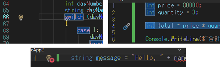 Visual Studioでコードを書いていると、行の左側に以下のような電球・ドライバ・エラー電球のアイコンが表示されることがあります。