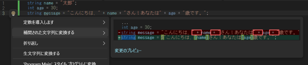 string message = $"こんにちは、{name}さん!あなたは{age}歳です。";以下のように電球アイコンがでたら、Ctrl+.で変換候補がでます。「補間された文字列に変換する」を選びましょう。修正後のプレビュー表示もできます。