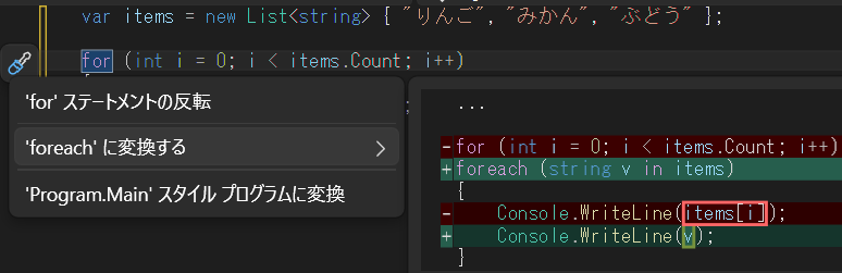 次は、ループの書き換えです。Visual Studioは段階的に、よりシンプルなコードへの変換を提案してくれます。