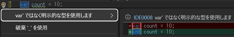 int count = 10;「‘var’ではなく明示的な型を使用します」を選びます。