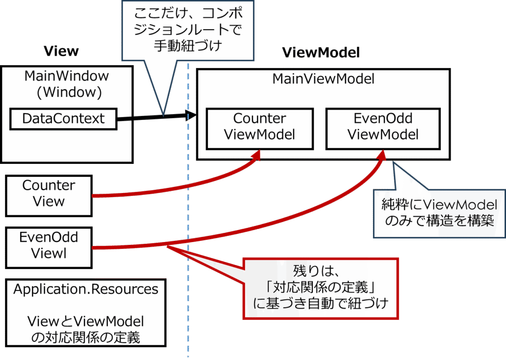 この2つを組み合わせると、以下のような仕組みが実現できます。ViewModelとViewの対応付けルールを定義(例えば、App.xaml内で定義)します。