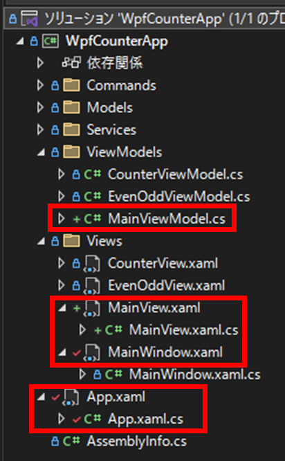 MainViewModelは、CounterViewModelとEvenOddViewModelを子として保持するシンプルな親ViewModelです。これでViewModelの階層構造ができました。