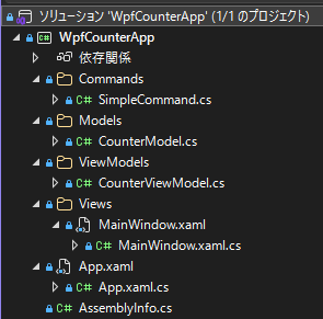 これまで学んできたMVVMパターンの基本を実装したシンプルなカウンターアプリを例にします。以下の構成になっています。(全コードはGitHubにあります)