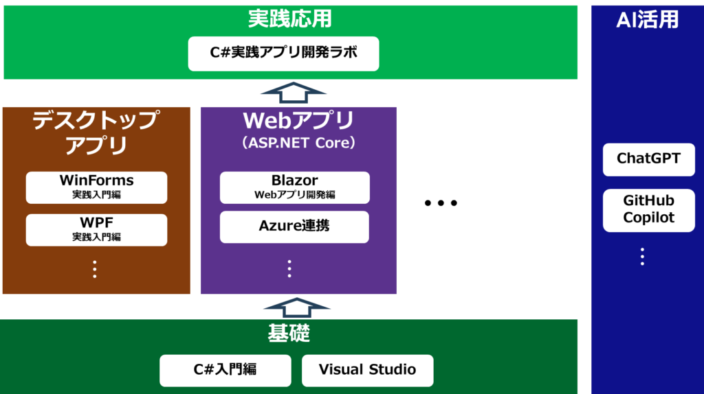初心者の方は「C#プログラミングの基礎」から、徐々にアプリ開発・AI活用へ進むのがおすすめです。