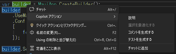 Explain(説明)、Generate Comments(コメント生成)、Generate Tests(テスト生成)、Add to Chat(チャットに追加)などがワンクリックで実行できます。