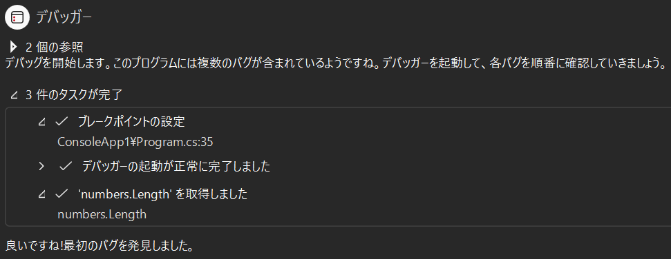 デバッガ用エージェントを使うと、AIが自律的にデバッグを行ってくれます。テスト失敗時にシームレスにその原因調査のデバッグを行うことも可能です。